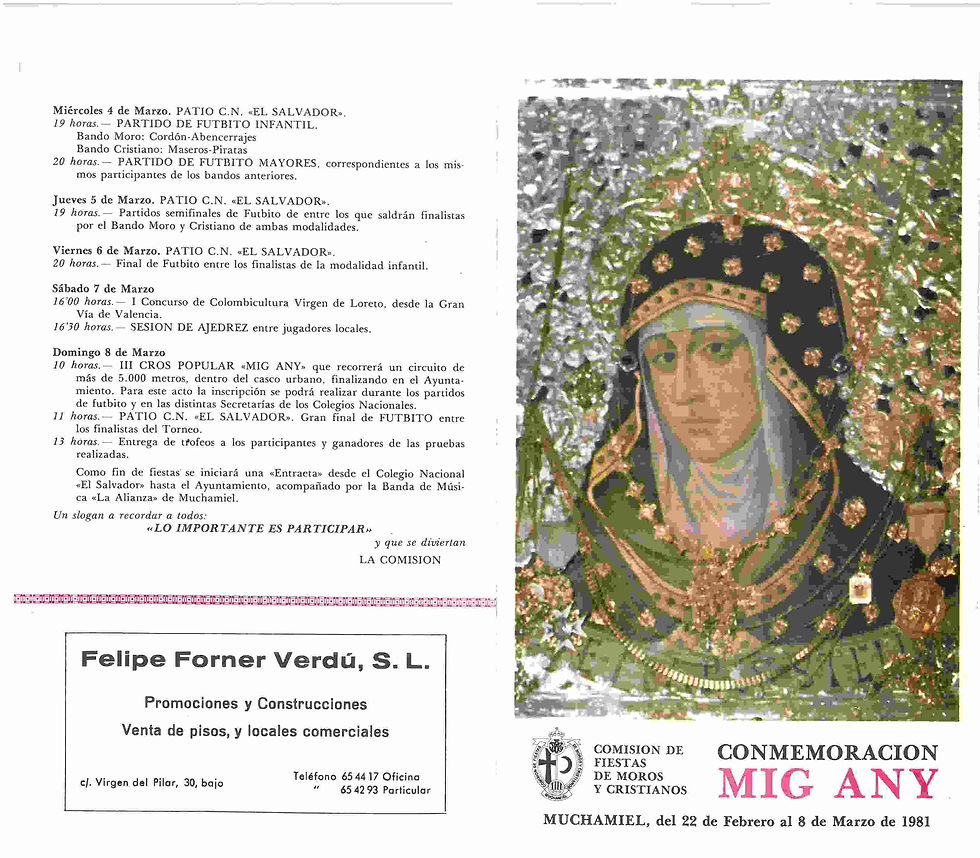 En 1981, ja trobem un programeta on clarament s’especifica “Conmemoración Mig Any” del 22 de febrer al 8 de març, i que anunciava gran quantitat d’activitats lúdiques i esportives on poder inscriure’s i participar-hi, a més de les funcions religioses: alborada, ofrena de flors i processó del dia 1. El pati del grup escolar El Salvador es convertix en el lloc per a celebrar els partits de futbol sala, futbol infantil; i el popular bar Casa Tuta, situat a la Rambla, és el punt de trobada nocturn on poder jugar els diferents torneigs de dominó, cau, cinquet.., amb les seues modalitats masculina i femenina. Eixe any també vam comptar amb el I concurs de Columbicultura, sessió d’escacs, s’inicia el primer concurs local de dibuix i, a l’aula de cultura de la CAPA, continua celebrant-se l'exposició de fotografia Memorial Rafael Pastor.